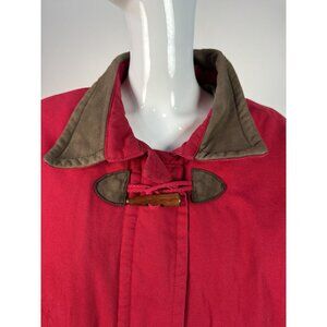 This Lands' End vintage-inspired duffle coat embodies timeless elegance with its sturdy build and classic toggle closure. Crafted with genuine leather accents, its vibrant red shell contrasts beautifully with subtle brown details. Perfect for cooler seasons, this medium-sized coat blends functionality with enduring style.