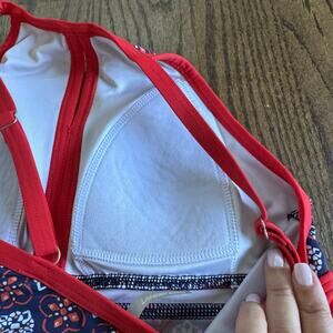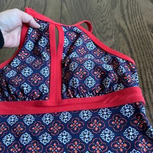 Lands End Womens Red White Blue Geometric Floral Tankini Swim Suit Top Size 4 Small. Halter style with soft molded cups. Size four. Like new condition.