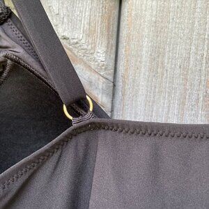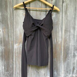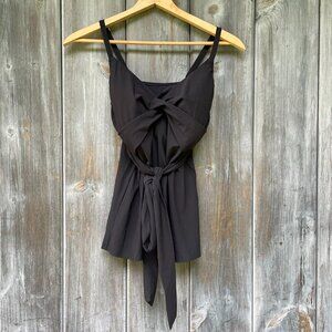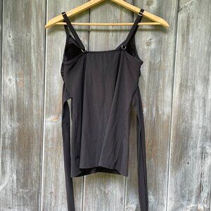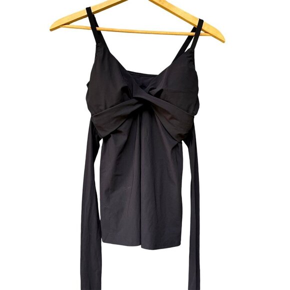 This glamorous black swimsuit tankini top from Land's End features a side-tie and wrap look. It has adjustable straps and a wireless bra. This top is in excellent used condition, with no signs of wear or flaws. It maintains all of its original stretch. A versatile piece that matches a variety of swim bottoms!