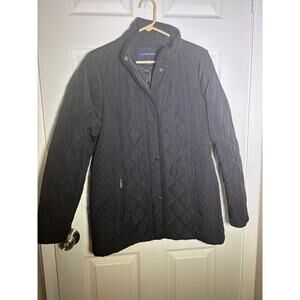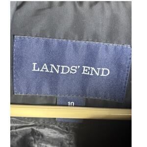 Lands' End snap Button and zipper clousure Womens Size M(10-12) Black Pockets light Quilted Lined Jacket. This is fall or spring jacket not a very heavy jacket for cold weather. Laying flat: