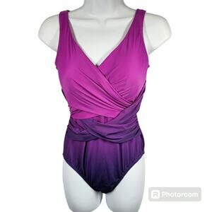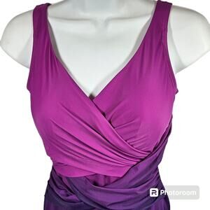 This gorgeous SlenderSuit from Lands' End is NWOT. It is a wrap-style one piece with scoop back in a beautiful violet/rose/navy ombré. The size is 8 Petite.
