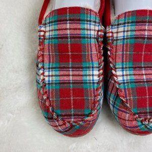Lands' End Women's Soft Flannel Moccasin Slippers Plaid Red NWOT