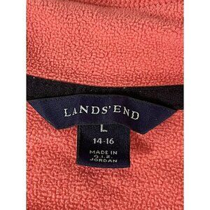 Lands' End woman's salmon orange fleece jacket with black sleeve detailing. Jacket has a full zip front and side zip pockets. It's made of 100% polyester and is a woman's size large (14-16).