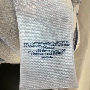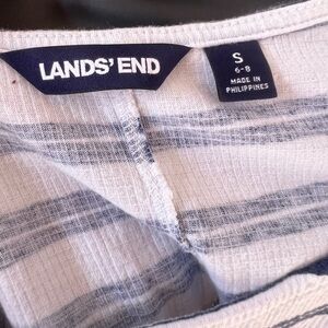 This is a women's Lands' End blouse in size small with a striped pattern in black and white. It features a crew neck, short casual sleeves, and ribbed texture. The blouse has a regular fit and basic style, perfect for everyday wear.