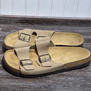 Lands End Women's Tan Leather Double Strap Slip On Comfort Sandal Size 9