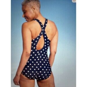 Lands' End Womens UPF 50+ Navy Blue Polka Dot One Piece Swimsuit Large (14/16)