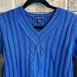 Keywords: Lands' End, blue sweater, pullover, women's fashion, V-neck, long sleeve, cable-knit, casual wear, fall fashion, ribbed cuffs, ribbed hem, cotton sweater, machine washable, pre-owned, regular fit.