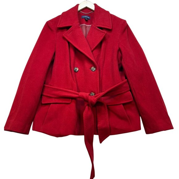 Lands' End Womens Wool Double Breasted Peacoat Long Sleeve Size 16P Red Tie Belt