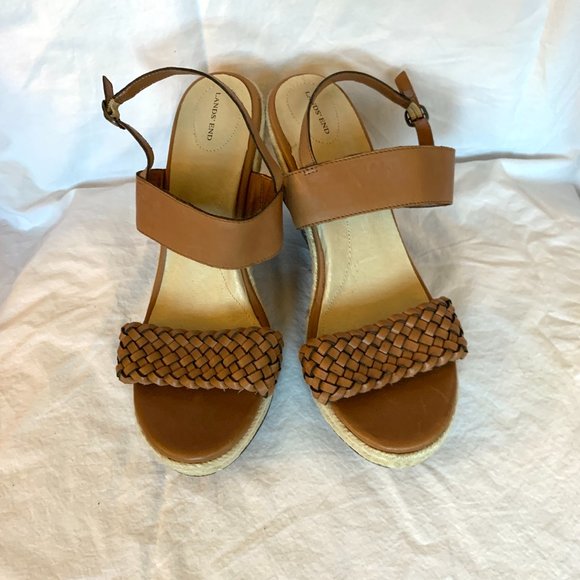 Wooden wedge with woven details. Made from leather. Never worn. Excellent condition.
