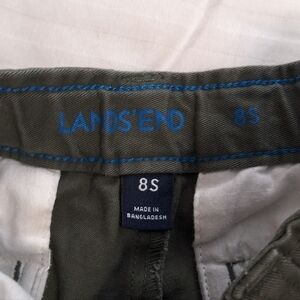 lands end army green flat front shorts with an adjustable waistband size 8s. please have a single button and zipper closure. two front pockets, and two back pockets. they're a nice medium weight. they have some stretch in the waist and the inner band to make the shorts smaller if you need. the waist measures 11 in, the rise measures 9 in, and the inseam measures 6 and 1/2 in. I have three pairs of shorts in the same brand and size but different colors and I offer 50% off any bundle of two items or more so bundle and save for back to school.