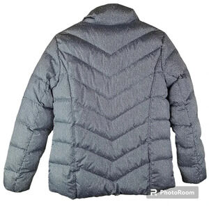 Lands' End black and grey Chevron puffer coat. This will be your go-to jacket as the weather starts to get cooler. It's lightweight enough to take anywhere with you, yet offers incredible warmth, thanks to its 600-fill power down. As with all our down jackets and coats, we use the latest technology Hyper Dry down, which is treated with a natural wax coating to make it water-repellent. That means that if it does happen to get wet, it won't clump together and lose its warming properties, but instead stay fluffy and keep you toasty warm at all times. The lovely pattern is sure to attract compliments too. Near perfect condition. No rips, tears, or stains.