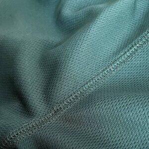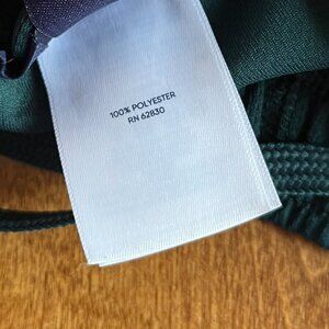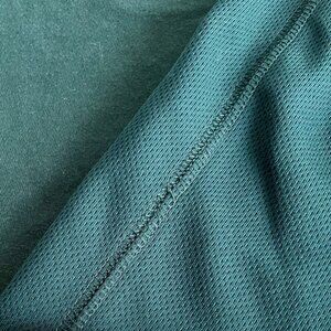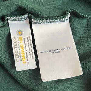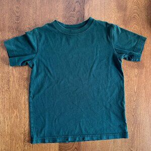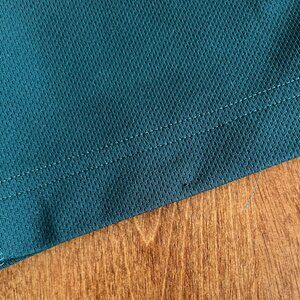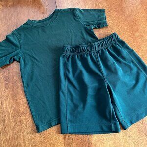 Lands' End forest green T-shirt and athletic shorts in Little Kid Medium (5-6). Both the shirt and shorts are from the school uniforms collection, though my child just likes this color. Shirt is 100% cotton, high-quality fabric with slight fading from the wash. Shorts are breathable mesh texture, 100% polyester, with a few very minor snags and wear on the seams (see close photos).