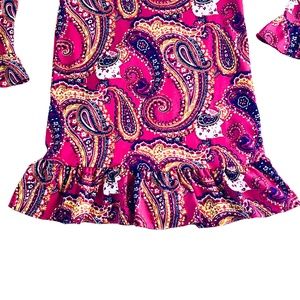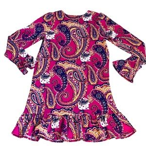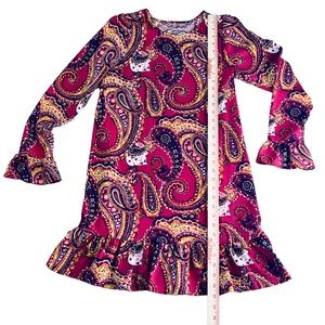 Lands' End girls paisley knit dress size 16. Great preloved condition- no rips/stains. Feminine ruffle at hem and at sleeve. Lively magenta background with blue, purple and accents of bright green, pink and white. Great with tights for dressier occasion or leggings for a more casual look. Will be perfect moving from cold weather in to spring! Long-wearing Lands' End quality