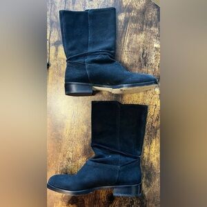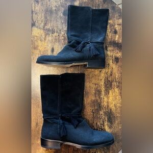 Womens Lands’ End, mid-calf, suede boots. 1” stacked, wood heel. 2- suede tassels on the side of each boot. Round toe. Worn only once. Very good, used condition. Great Lands’ End quality.
