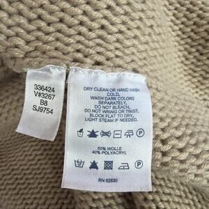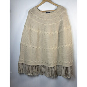 Lands End large XL Poncho Sweater Tan Pullover Cable Knit Fringe Wool Blend