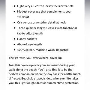 Three-quarter sleeves with functioning tabs to lengthen, pockets and darling neck detail make this a very comfortable and lightweight packable cover-up.