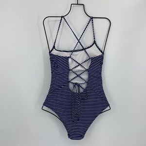Lands End navy blue stripe swim white one piece swimsuit tie strappy new 6