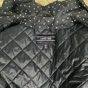 Lands’ End raincoat. Size XS. Hooded and belted, with detachable buttoned vest for added warmth. Navy blue with white polka dots. Great condition.