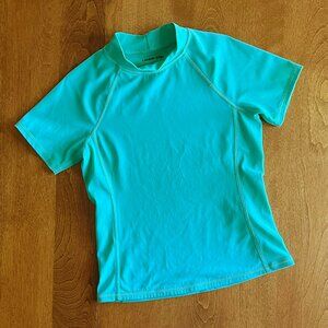 Lands' End seafoam or aqua green short-sleeve swim rashguard in Little Girls' Large (6X-7). Green color in the photos is most accurate in the close photos with tags and size. Front of the top is fully lined, so it can be worn as a swim top on its own or layered over a swimsuit. GUC; slight wash wear, a few minor spots of discoloration.