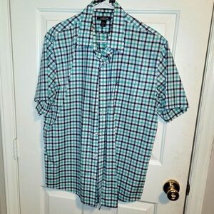 Land's End short sleeve Teal and Navy Plaid Button-down size L