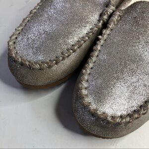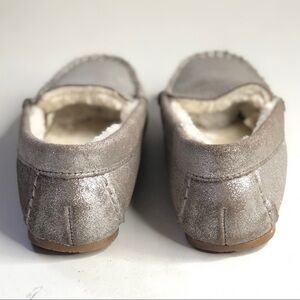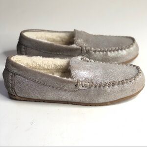 Lands’ End silver metallic leather slippers faux fur lining moccasins mocs 6