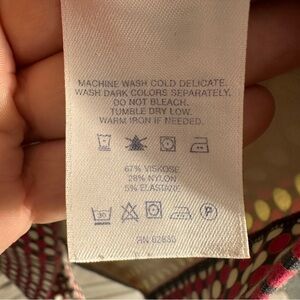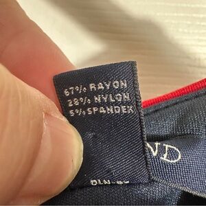 Lands' End dress, size 12, midi length, ponte type of material with stretch. Navy with red and white polka dots, keyhole neckline, defined waist, 2 pockets. Back zip with hook/eye closure. Back slit. 67% viscose/28% nylon/5% elastane.