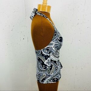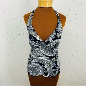 Land's End size 4 Black & Gray Paisley Swim Tankini Top in good preowned condition. Lightly padded not removable tie neck