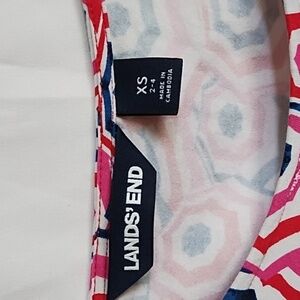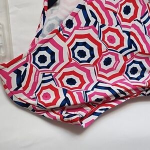 Red white pink and blue umbrella pattern. Gathered at side waist. Stretchy 16 inches across 16 inches shoulder to waist 40 inches overall length.