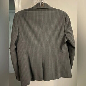 Lands End woman’s blazer size 12. EUC. Charcoal with light gray thin stripes and fully lined. RN#62830. Two button closure and 4 button sleeve accents. Wool/elastane/poly blend. L:29/ Pit:20/ Sleeves:24