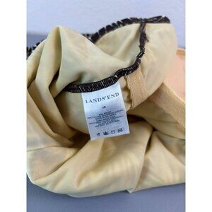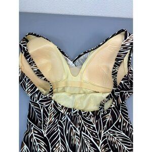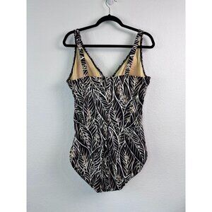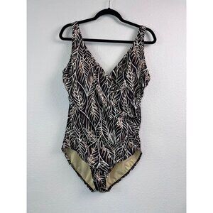 Lands' End brand women's size 18 brown and cream leaf patterned one piece swimsuit. In excellent pre-owned condition, only flaw is a small discoloration on the inside, please see pic. Not visible when worn. Faux wrap style top with a v-neckline. Has a built in bra with sewn in lightly lined wireless cups.