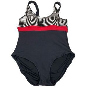 Lands' End Coastal Spirit One Piece Swimsuit. Padded Cups with Underwire, Gold Tone Lands End Logo on Back. Black Stripe Colorblock Suit Ribbed texture.