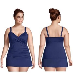 New Land’s End Plus size adjustable straps Navy blue tankini, and V-neck wrap with underwire and soft foam cups, adjustable straps, sizes below.