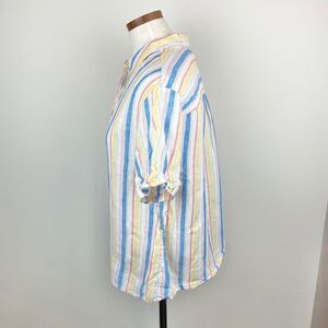 This blouse is in excellent condition. Featured with buttons up the front and short sleeves. Bright pastel striped colors throughout. Made from 100% linen and size 8. Please send any offers or questions!