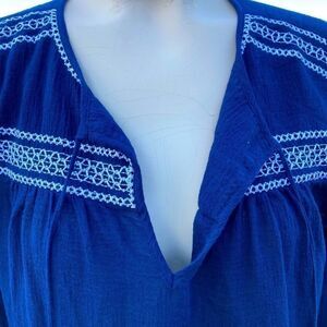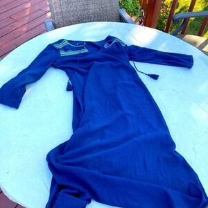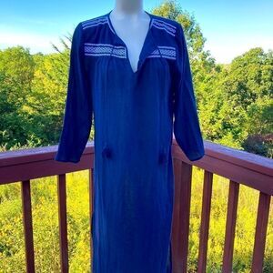 Land’s End Delicate white embroidery and blue tassels V neck embellish this beautiful long, long ephemeral cover-up dress navy blue size SMALL