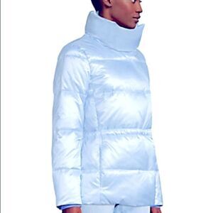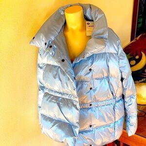 New with tags Land’s End down jacket 600 fill hyper dry Premium carbon free water resistant down quilted jacket, ice blue color Medium Petite