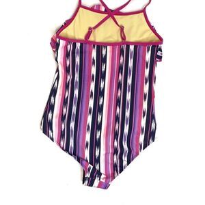 Lands End pink and purple vertical striped one piece swimsuit size 12+ kids. Ruffle top. Shelf bra. Adjustable cross straps. Very good condition. Length 26” Chest 14”.