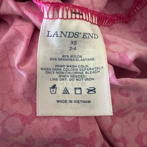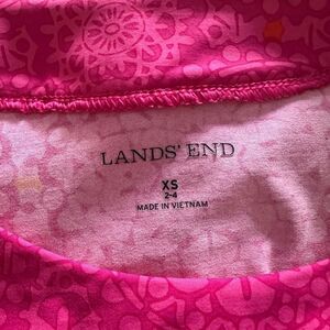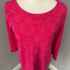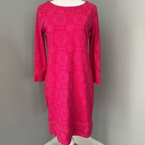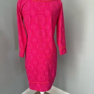Step out in style in this chic, pink dress by Lands End in a medallion print with orange piping and accent. Perfect for any occasion, this dress combines comfort and fashion effortlessly. 3/4 sleeves in a nylon and spandex blend. L 33” x W 17” put to pit.