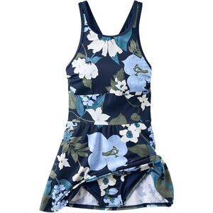 Land's End plus high neck Tugless Swim Dress One piece bathing suit deep sea navy lilies in various sizes below