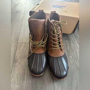 Stylish brown and black duck boots with lace-up design. Perfect for outdoor adventures.