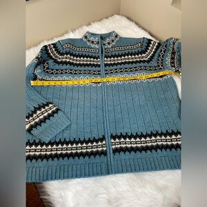 Like new. Probably never worn. Pretty teal blue with grey and white fair isle design. No flaws. Hefty knit. Made in Hong Kong. Norwegian inspired.