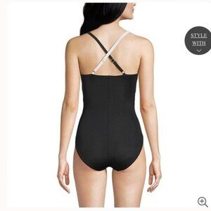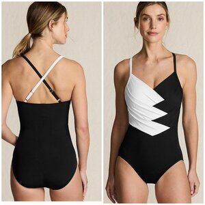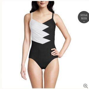 Dive into the season with the Lands' End Women's Slender Suit V-neck Pleated X-back One-Piece Swimsuit, a classic blend of style and comfort. This swimwear piece, sized at for a regular fit, features a timeless black and white color scheme that effortlessly complements your beach day or poolside relaxation ensemble.