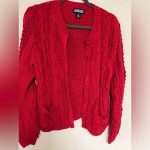 Cozy red cardigan with intricate cable knit design. Perfect for layering and adding warmth.