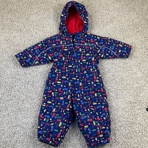 Excellent condition navy one piece snowsuit with car print design! Zips the whole way down and has rubber lining at hem to keep in place over boots. Very warm!