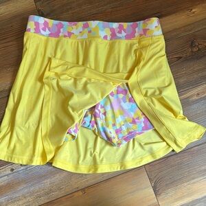 Super cute skort in a cheerful yellow color with adorable multicolor under shorts great fabric great stretch perfect for any active person or someone who is leisurely active.
