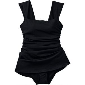 Land's End Plus and Standard sizes Smoothing Square Neck Wide Straps Ruched 1 piece Swimsuit Black in various sizes below