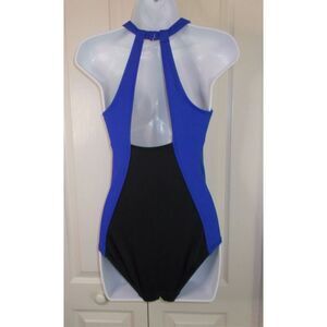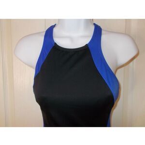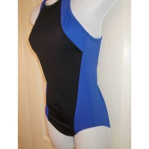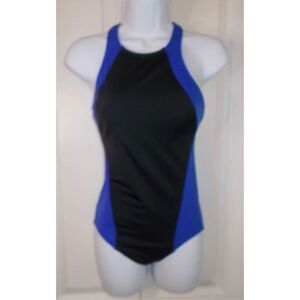 Land's End Size 12 High Neck One Piece Swimsuit Black Blue Colorblock Sporty