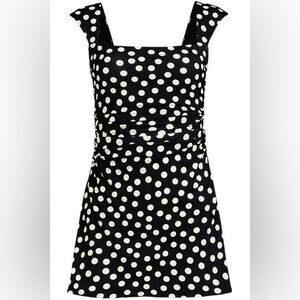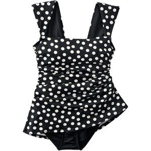 Land's End Smoothing Square Neck Ruched 1 piece Swimsuit Swim Dress black egret, white tossed dots size 10