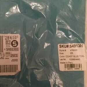 The jersey is Lands' End long sleeve Suprima cotton crewneck. Coast Teal Blue. Style number 476520 in a size 2X. (Shirt is winkled because it was taken out of bag to illustrate color and style.) Never worn, never washed from pet free non -smoker house. Approximate measurements, from shoulder seam to shoulder seam is 18". Shoulder seam to arm edge is about 23 1/2". From shoulder seam down to bottom edge is about 28" long and the width of bottom edge is about 26". Machine Wash