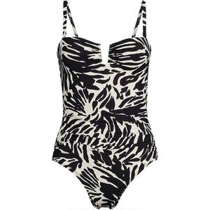 Land's End Plus and Standard sizes slender suit tummy control U wire bandeau piece swimsuit in color way Black Egret White Leaf Scroll sizes below