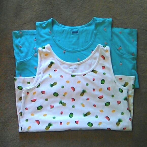 Two cute tanks. A medium and a large. Basic Editions L : Turquoise with flamingos, measures 42 at chest, 48 at bottom hem, 25 long. Lands' End M: fruit salad, measures 38 at chest, 45 at bottom hem. 25 long. Two great choices for warm weather.
